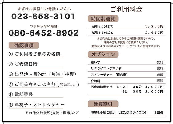 | ●サービス提供区域: 山形県内なら、どちらからご連絡いただいてもお迎えにあがります。 ※サービス提供区域以外でも利用者より依頼があればサービス提供を行います。 ●福祉介護タクシーのお申し込み方法は当社に直接ご連絡下さい。 ![]() |